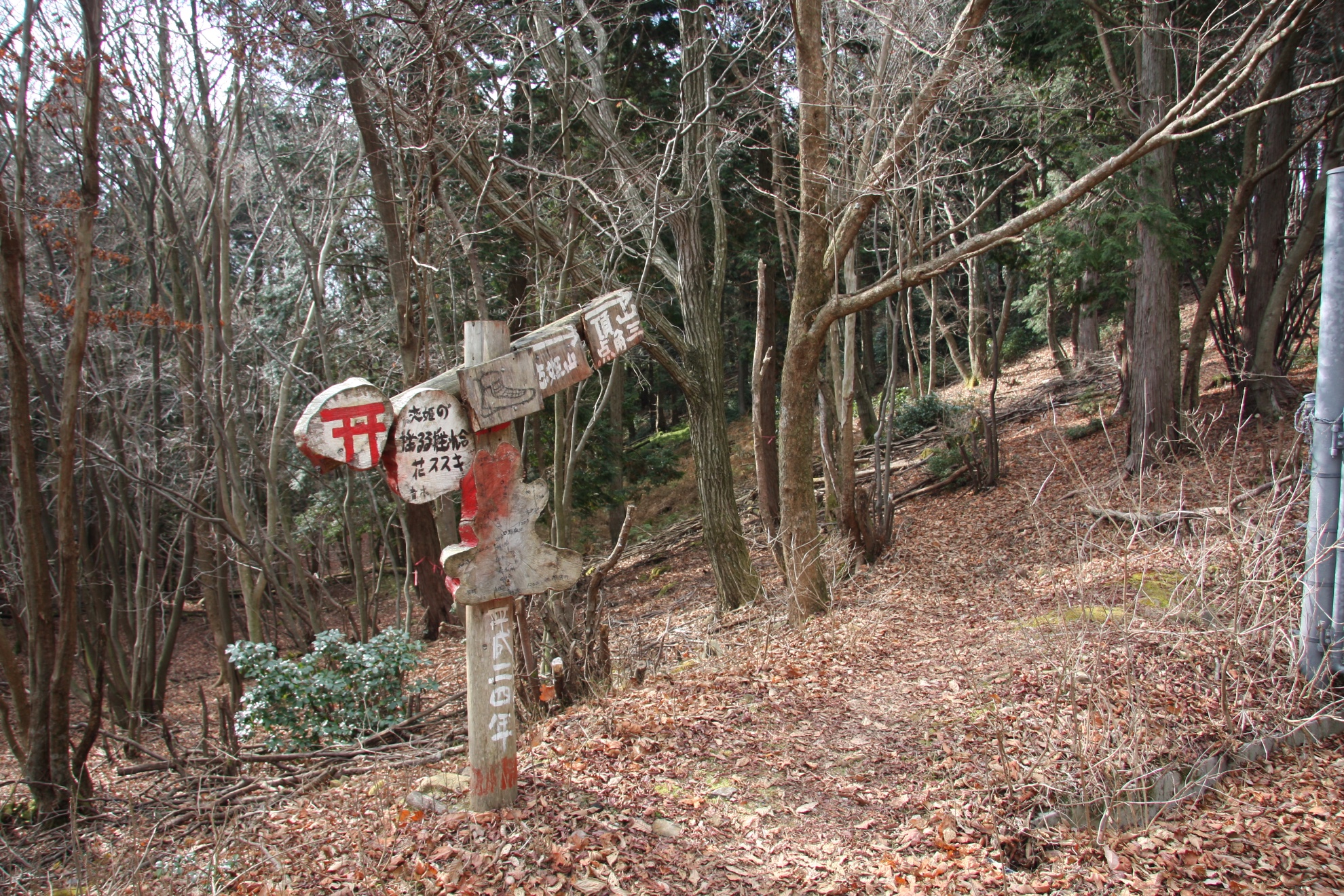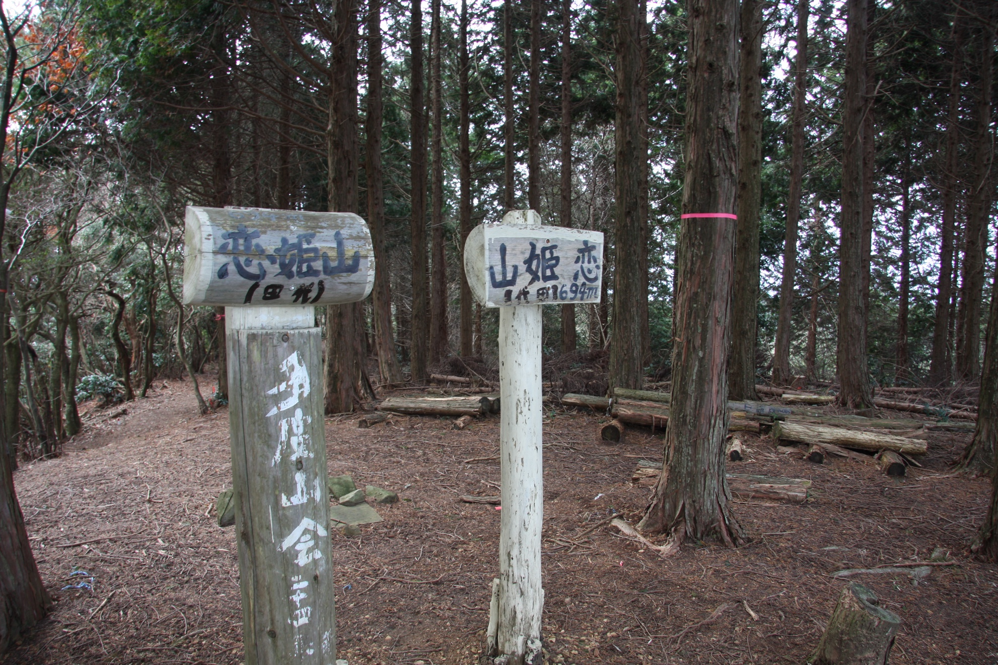 ここから更に進むと、林道が込み入っている上に、標識は小さくわかりづらいので迷いそうですが、途中で林道を南に進み旧の登山道に見つかるのでそちらに行くと、また別の林道に出て標識に恋姫山の方向が出ています。