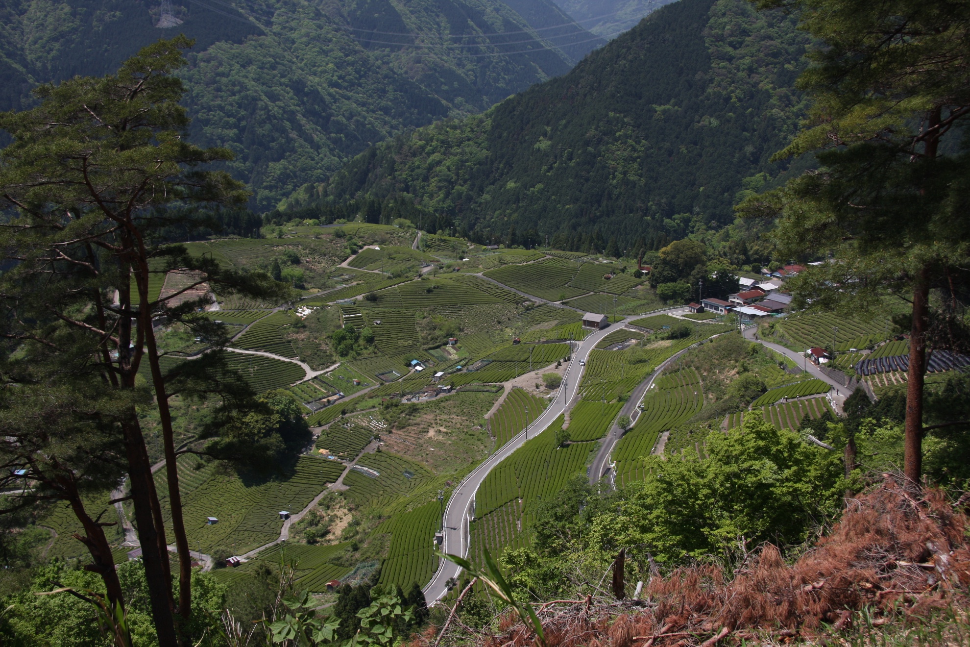 そこは街の中心より標高が高く、斜面にはお茶畑が広がっているため、このような展望の景色を見ることができます。